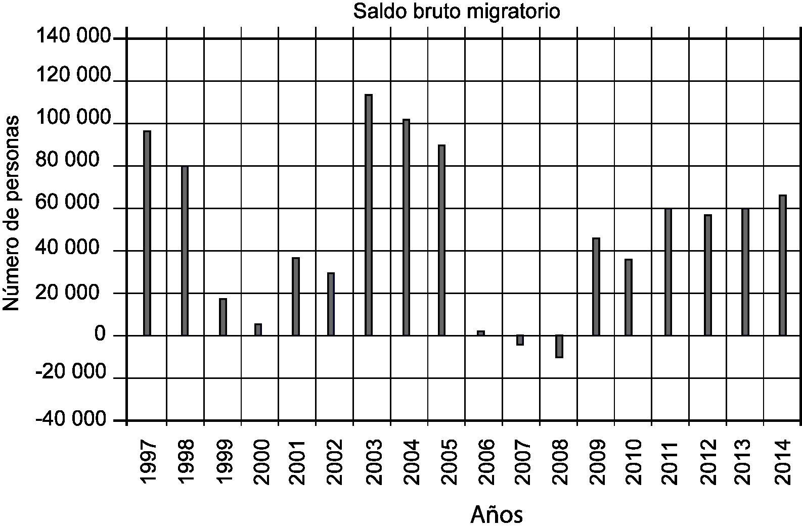 La diferencia entre las entradas y las salidas internacionales que se registran en un país es conocida como saldo bruto migratorio. Tras la crisis en Estados Unidos, originada por el colapso de la burbuja inmobiliaria, el país tuvo varias repercusiones, especialmente en el ámbito económico, lo que pudo haber influido en la tendencia migratoria. Según los datos mostrados en el gráfico, se puede concluir que en la mayoría de años la cifra del saldo bruto migratorio fue _______, con un cambio entre 2007 y 2008, cuando las entradas al país fueron _______ que las salidas que se produjeron.