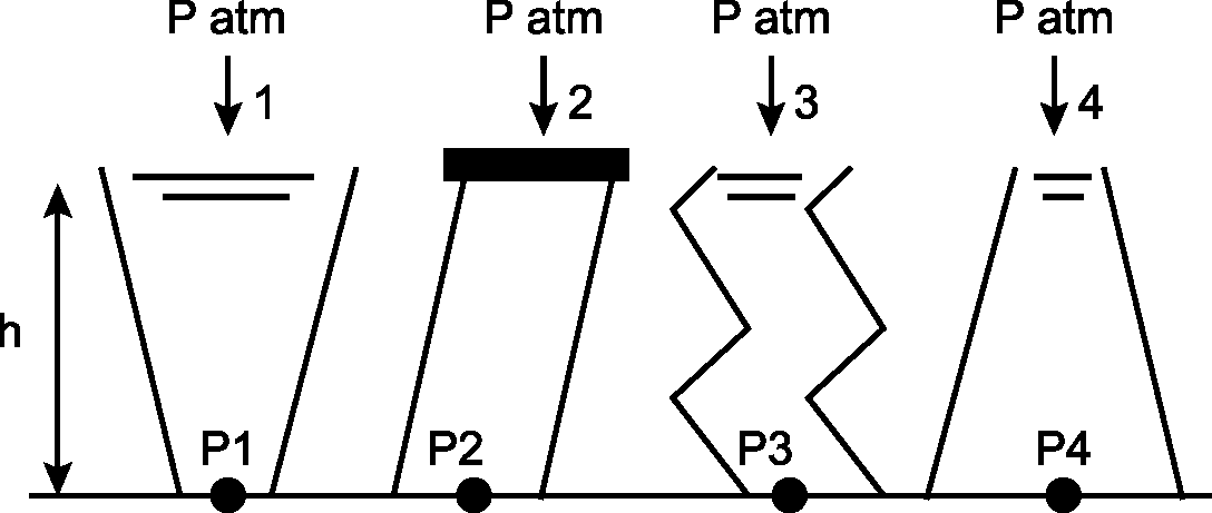 La gráfica muestra cuatro recipientes de diferentes formas que contienen agua hasta el nivel indicado; uno de los recipientes está cerrado, mientras que los otros están abiertos al ambiente.