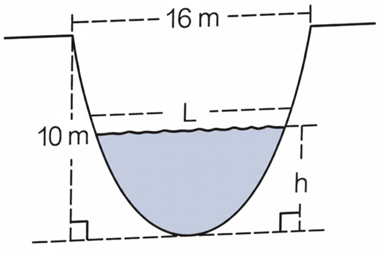 La figura adjunta muestra la sección transversal de un canal semielíptico. Halle el ancho L de la superficie, cuando el canal lleve agua a una profundidad de 5 metros de altura (h = 5 m). Considere que el ancho total superior es 16 m y la profundidad máxima es 10 m.