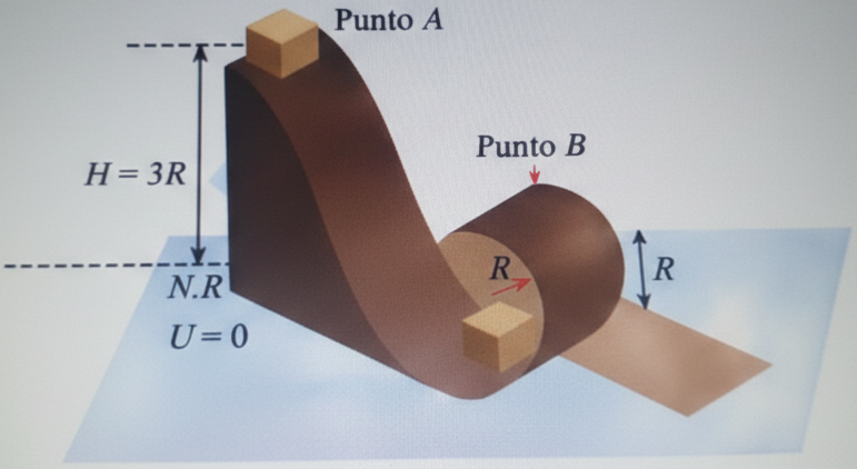 Se deja caer un bloque de masa m desde el punto A como se indica en la figura. Calcular la energía mecánica en el punto C. Considere que g = 9.8 m/s², la masa es de 10 kg y el radio R = 2m.