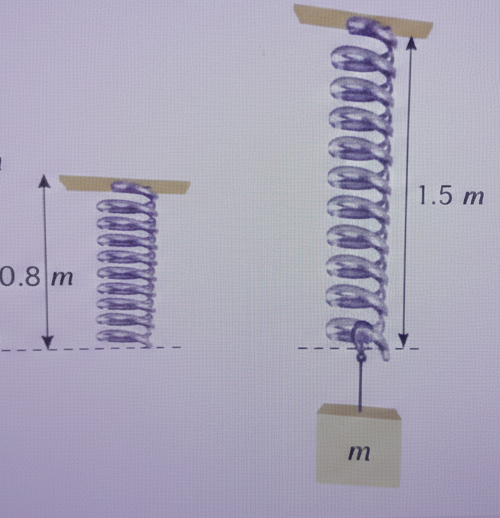 En la siguiente figura se muestra un resorte de 0.8 m de largo que se estira desde su posición de equilibrio hasta una longitud de 1.5 m cuando se coloca una masa m en su punto inferior. Si cuando el resorte está estirado tiene 25 J de energía, calcular el valor de su constante elástica.